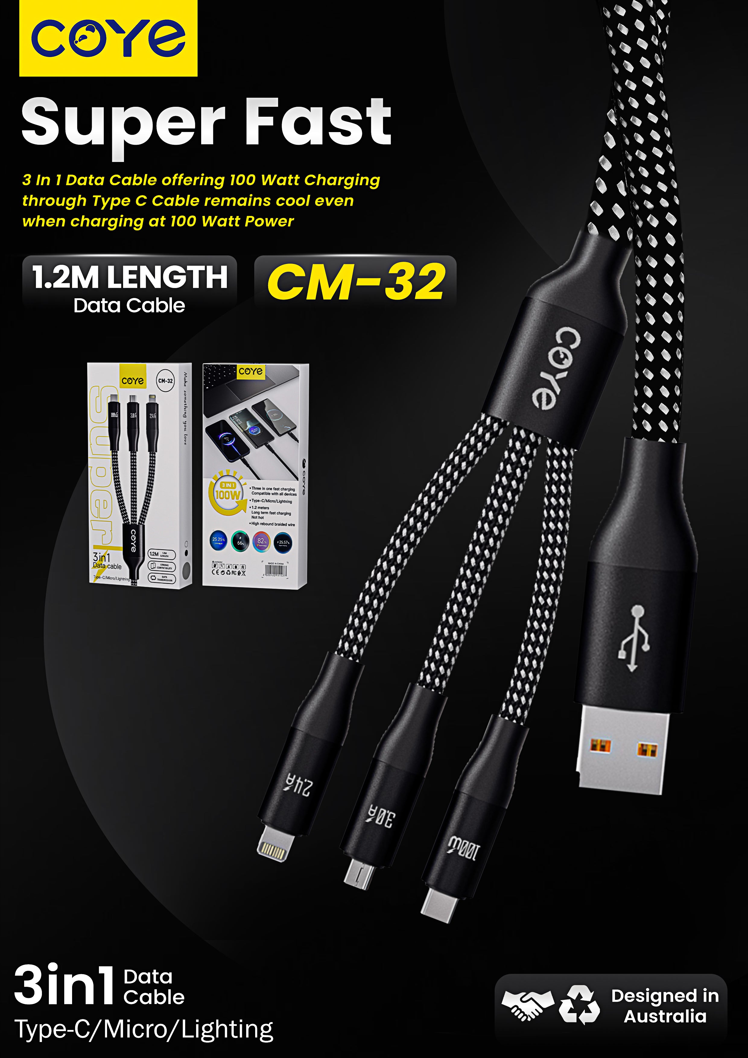 COYE 1.2m 4ft High-Rebound Nylon 3-in-1 Fast Charging Data Cable – USB-A to USB C 100W/Micro USB 3A/Lightening 2.4A Cable Wear Resistant Braided